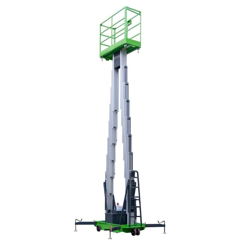 Mobile aluminum aerial work platform with motorized pulling device and extension platform, compared with mast aluminum AWP, it is equipped with the electric motorized device with moving and turning function. It is in manually traction; easily move, saving manpower and time. Driven by hydraulic motor, turning and lifting by battery in DC power, no external power required. It brings more efficiency and convenience as an ideal and most useful aerial working facility. The electric Self-propelled device can be configured in any of the lifts. And the extension platform can extend 0.8m on one side, there is no need for you to moveth machine to other place within 0.8m, Only double mast aerial work platform can equipped with extension platform.